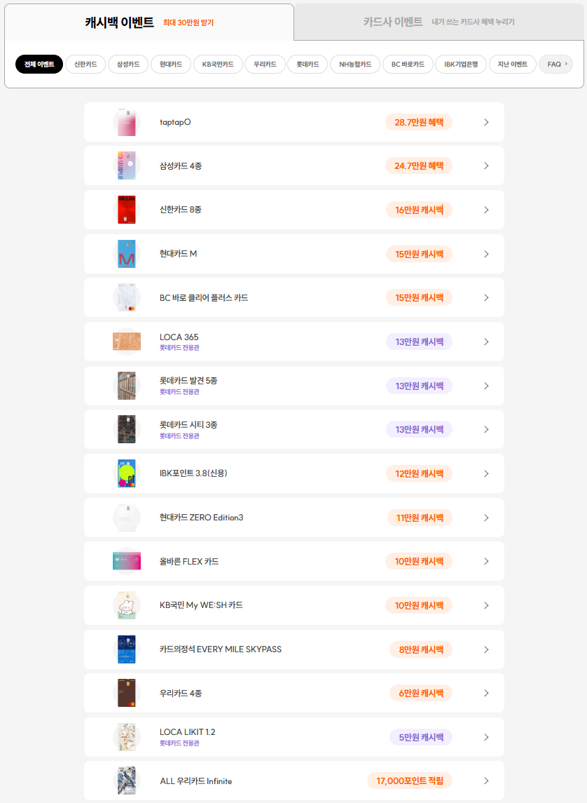 그 이외에도 캐시백 이벤트를 진행 중인 여러 카드사의 카드를 종합해놓은 카테고리도 있는데 위 방법들을 이용하여 원하는 카드를 고르신후 캐시백 이벤트를 진행중인 카드도 함께 확인하여 카드를 선택하는 것도 좋은 방법이라 생각합니다. 카드고릴라에 방문하셔서 여러분도 본인에게 맞는 카드를 찾아보시는 것을 추천드립니다.